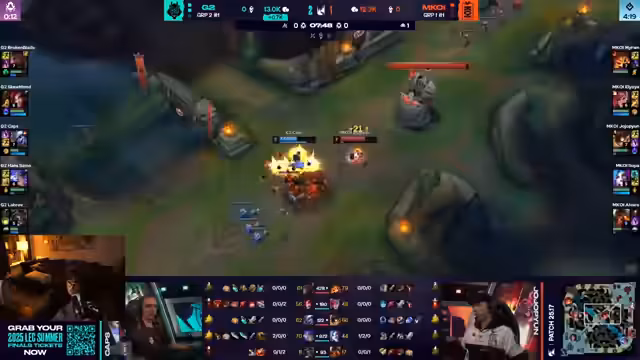 06:57:46Das Gameplay konzentriert sich auf die Map-Kontrolle und die Teamfights. Kapp zeigt ein starkes Trading, während Skarner und Mervin im Jungle unentschieden stehen. MKOI-Botlane sieht aufgrund von Nikos Range und Poke als unangenehm an. Jojoplay wird für seine aggressiven Aktionen gelobt, während G2 versucht, durch Drakes und Objektive Vorteile zu erzielen. Die G2-Botlane wird zu Beginn des Spiels als schlecht eingestuft, dreht aber im Laufe des Spiels auf. Ein Fumble bei MKOI führt zu einem Vorteil für G2.
