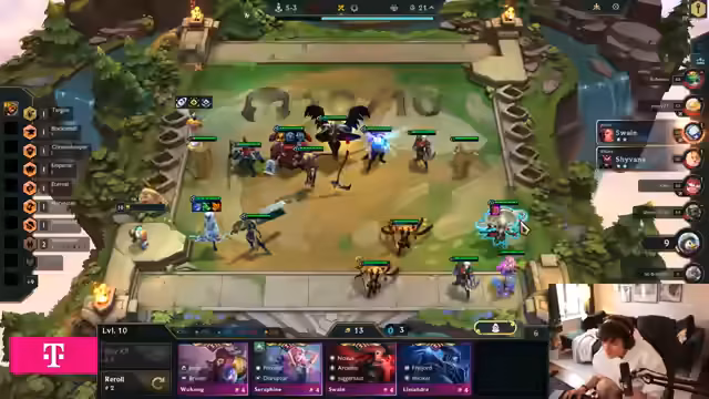 03:10:03Während des Spiels von Teamfight Tactics (TFT) experimentiert der Streamer mit verschiedenen Builds und Champions. Er erwähnt, dass er noch in seinen Placements ist und denkt, dass ein Spiegelbild-Strategie mit dem Taktiker möglicherweise nicht die beste Wahl war. Er entscheidet sich, als Paladin in einer Allianz zu spielen, und stellt fest, dass Sona und Anivia in Stage 2 bereits überraschend viel Schaden machen, obwohl sie keine optimalen Items haben.