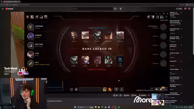 00:05:39Im ersten Spiel wählt der Streamer Rakan als Champion und merkt an, dass er mit einer englischen Tastatur und einer ungewohnten Maus spielt, was die Steuerung erschwert. Er reflektiert über die bevorstehende Hard-Reset-Änderung in der Liga und deutet an, dass er sich in einer niedrigeren Elo befindet, was die aktuelle Situation etwas entspannter macht. Das Spiel beginnt mit einigen ungewöhnlichen Initialzügen.