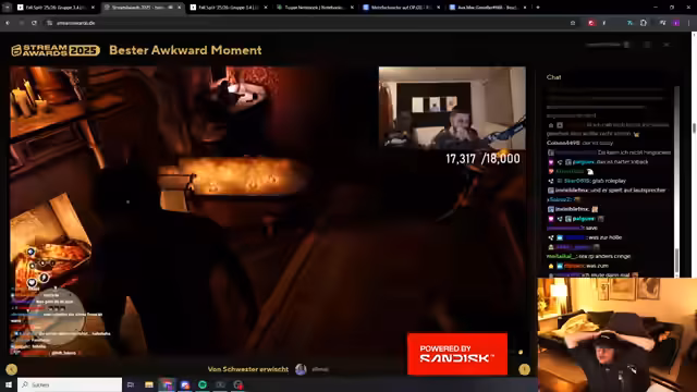 00:12:44Der Streamer zeigt große Freude über die Nominierungen für die Stream Awards, insbesondere in den Kategorien bester Moment und bester IRL-Moment. Er analysiert verschiedene Clips und Kandidaten, darunter humoristische Gaming-Momente und IRL-Inzidenzen. Dabei wird die Vielfalt der nominierten Inhalte und die Schwierigkeit der Entscheidung betont.