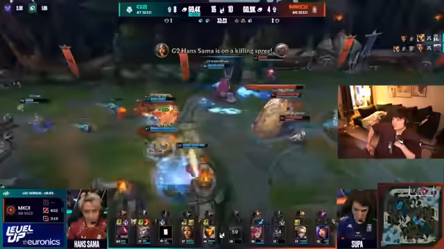 05:59:13Skümmon wird als der herausragende Spieler der gesamten Serie gefeiert. Seine performance auf Jarvan wird als 'insane' und 'koreanischer Kaiser' beschrieben. Er hält G2 im Spiel, indem er im entscheidenden Teamfight den Baron gehittet und den Fight mit einem perfekten W-Flash-Ult gewonnen hat. Der Streamer ist beeindruckt und meint, dass Skümmon Firmenanteile verdient hat, da er das gesamte G2-Team auf seinem Rücken trug.