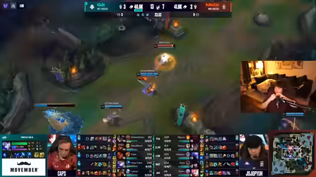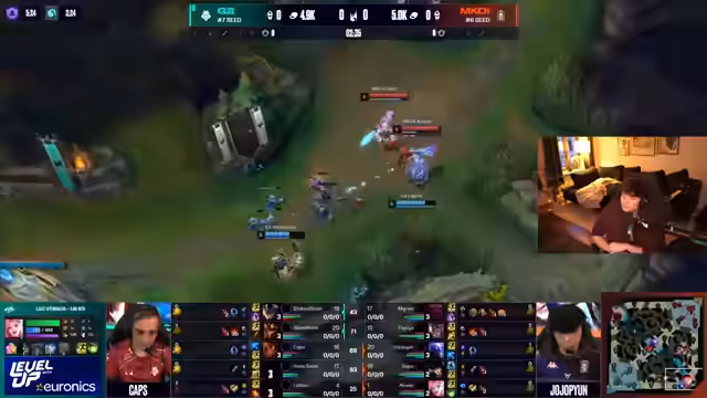 05:00:41G2 kontrolliert das zweite Spiel komplett durch überlegenes Map-Push und Objiv-Kontrolle. MCOi macht dabei strategische Fehler. So verpasst es, einen Drake ohne gegnerischen TP zu spielen, obwohl der eigene Top-Laner TP hat. Dieses Versäumnis führt dazu, dass G2 die Kontrolle über das Spiel übernimmt und MCOi defensiv gestellt wird und kaum noch Chancen hat.