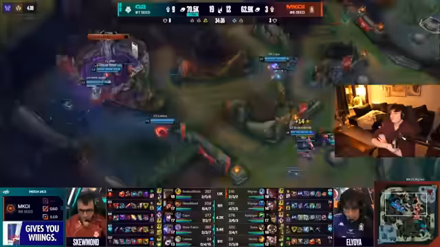 03:54:46Im Mid-Spiel entscheidet sich das Spiel um die Kontrolle über die Objektive. M-KOI hat mit zwei Mountain Drakes einen Vorsprung und kontrolliert das Spiel. G2 versucht, in den Fights die Oberhand zu gewinnen, während M-KOI den Druck aufrechterhält. Der Streamer bewundert die Leistung von Labrov von M-KOI, die eine schwierige Lane meistert. G2 ist gezwungen, zu reagieren und sucht nach einem Fight, um das Spiel zu drehen, während M-KOI die Schlinge enger zieht.