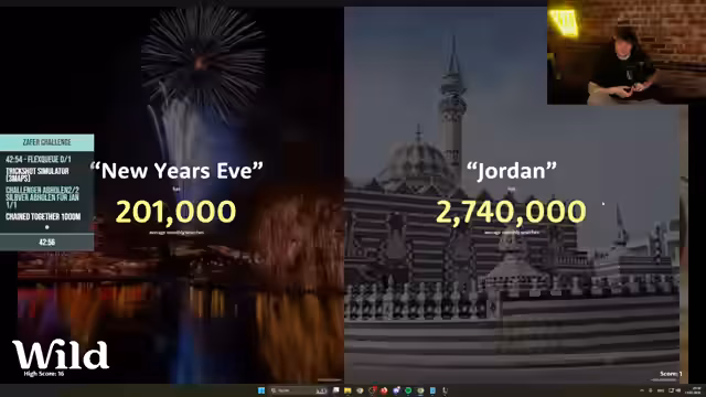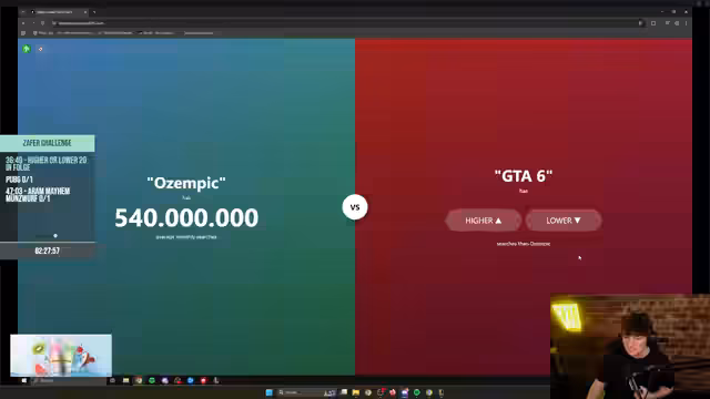 00:17:02Während die Wartezeit auf das erste Spiel der Win-Challenge dauert, beginnt der Streamer spontan ein Higher/Lower-Spiel mit dem Chat. Bei diesem Spiel geht es darum zu erraten, ob ein bestimmter Begriff oder ein Land online mehr Suchanfragen pro Monat hat als ein anderer. Es entwickelt sich ein intensives und oft witziges Spiel, bei dem der Streamer und seine Mitstreiter über verschiedene Themen wie Sport, Geografie und Kultur raten und diskutieren.