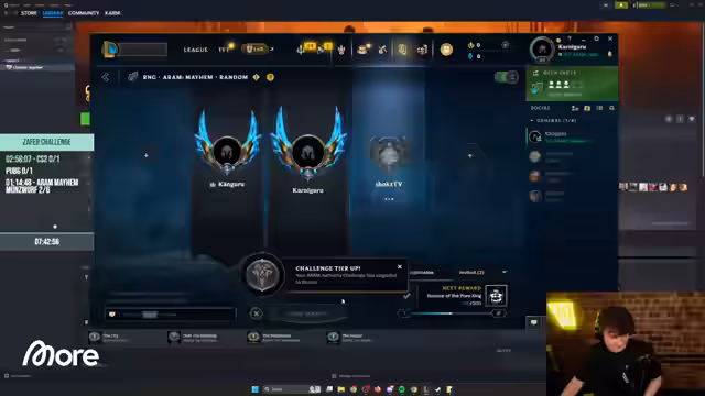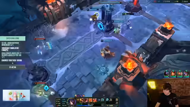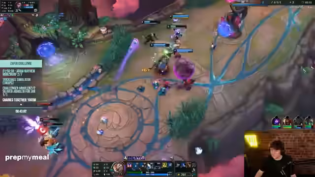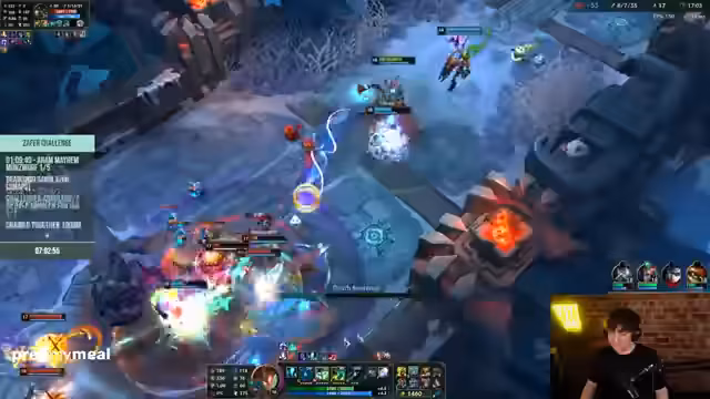 08:09:59Nachdem das Hauptspiel 'Chained Together' erfolgreich abgeschlossen wurde, wechselt der Stream zu einem anderen Spiel, 'ARAM Mayhem', einem Modus aus League of Legends. Der Streamer äußert seine Verärgerung über das Hauptspiel und betont, dass er nun 'richtige Spiele spielen' möchte. Der Fokus verlagert sich auf das kompetitive Gameplay in ARAM.