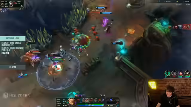10:09:05Im Fokus stehen die hektischen Aram-Kämpfe. Der Streamer und sein Team kämpfen um das Überleben in der Wave, während er eine ultimative Fähigkeit einsetzt. Es wird eine kritische Situation beschrieben, in der der Gegner mit 'Kingmeat, Juul, Gauntlet und Eureka' einen extremen Highroll landet, der das Spiel augenscheinlich entschieden. Der Ausdruck 'quantum computing' für das unerwartete Gegnerplay verdeutlicht die Frustration über den hohen Zufallsfaktor, auch wenn sich der Streamer einredet, dass man bei besserem Wissen genauso highrollen würde.
