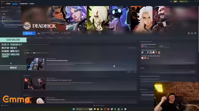 08:59:58Nach erfolglosen Versuchen, mehrere Stunden in Counter-Strike zu queuen und nur ein Spiel zu finden, wird das Spiel vorerst gestrichen. Stattdessen soll Deadlock gespielt werden, da die Community dies als fair vorschlägt. Das Spiel Vallo entfällt, da die benötigten Accounts nicht gelevelt sind. Die Pläne für die restliche Abendgestaltung sind noch offen, wobei Aram Mayhem und Dota im Raum stehen.