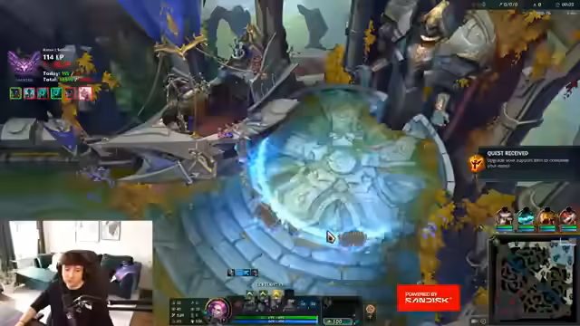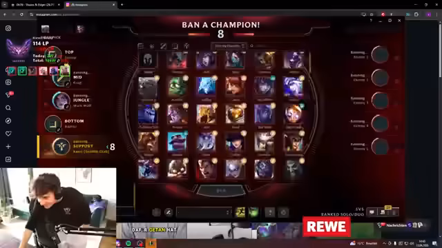 05:31:46Der Streamer analysiert die Fähigkeiten von Jhin, insbesondere 'Refresh your ultimate after casting it' und entscheidet, den Champion zu spielen, da die Gegner keine echten Tanks haben. Er spricht mit Anne über das Muten von Kani, der ihn nerve, und beschreibt ein gefiltertes 4-Mann-Echo-Stun-Gefühl. Er kritisiert, dass sein Goliath in diesem Match-Up schlecht wäre, und wird von Kani 'gespaced'. Er gibt an, trotz seines niedrigen Ranks noch 4.500 LP über einem anderen Spieler zu haben und fragt nach dem Ego des anderen.