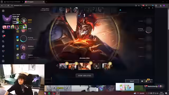 05:28:51Der Streamer startet mit dem Management der Game-Lobby und betont, dass es keine Bevorzugungen gibt und jeder Spieler selbst joinen muss. Er bemerkt, dass Kani zweimal in der Lobby ist und bittet einige Spieler, Platz zu machen, um eine gute Zirkulation zu gewährleisten. Er wechselt dann den Champion zu Jhin, der einer der coolsten Champions ist, und stellt fest, dass er ein Mythmaker-Chroma nicht ausgerüstet hat, was er als 'My bad' bezeichnet. Er äußert überrascht, wie viel Spaß das Spielen von zufälligen Champions heute gemacht hat und überlegt, dies häufiger zu tun.