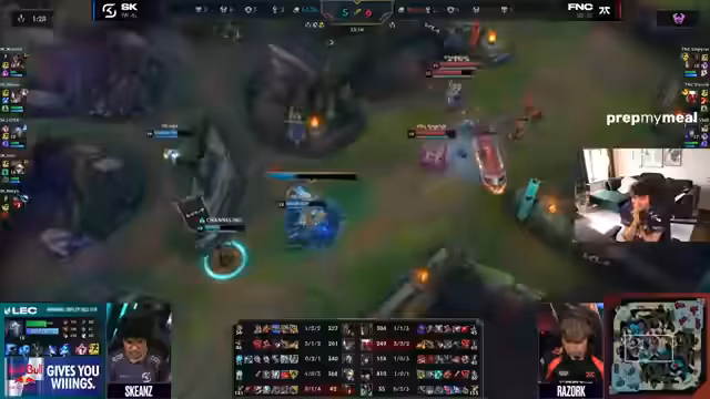 09:12:35Im Anschluss an die Pizza-Anlieferung wird ein noch laufendes Spiel zwischen Giant X und Shifters tiefgehend analysiert. Der Streamer bewundert die Draft-Entscheidungen von Giant X, speziell den Bart-Pick, und die starke Performance des Spielers Isma. Die Teamfight-Koordinierungen, der Vision-Krieg und die strategischen Entscheidungen rund um Drakes und Baron werden intensiv besprochen. Besonders der Einfluss von 'Mountain Soul' als objective buff wird als spielentscheidend angesehen.