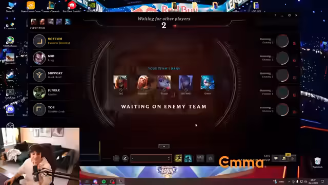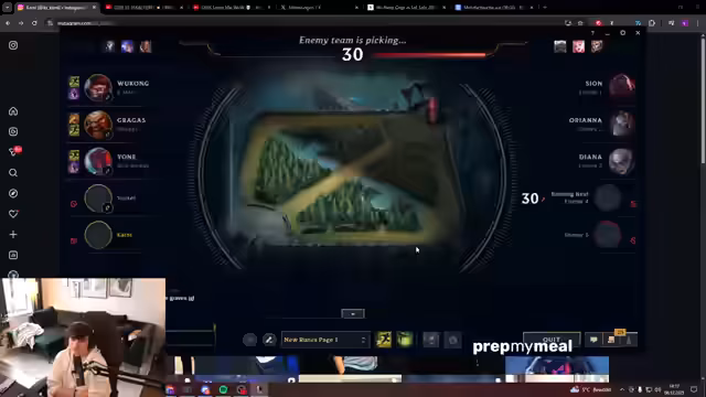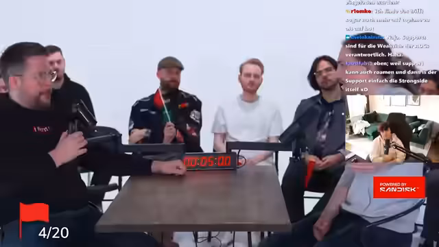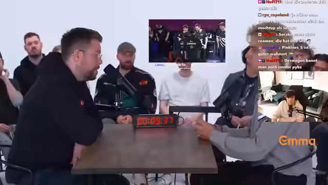 07:55:52Unmittelbar vor dem nächsten Play-off-Spiel wird intensiv über die Champion-Auswahl diskutiert. Der Streamer und sein Team evaluieren die Picks und Banns des Gegners, insbesondere den Thresh- und Volibear-Main. Es kommt zu strategischen Überlegungen über die Synergien, wie z.B. eine Kombination aus Xin Zhao und Seraphine, während auch eigene Schwachstellen wie die Angst vor Thresh thematisiert werden.