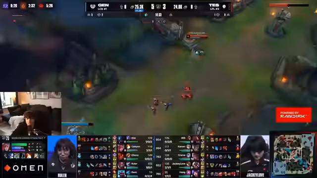 03:21:48Das Gespräch beginnt mit einer Analyse der laufenden Worlds-Spiele. Der Kommentator bewertet die Leistung von Teams wie Gen.G, die als derzeit unschlagbar gelten, und Teams wie G2 und KT, die als schlagbar, aber auch unzuverlässig beschrieben werden. Es werden spezifische Spielzüge und Fehler von Spielern wie Cream von TES angesprochen, die zu Vorteilen für Gen.G führen, und der Kommentar hebt die Dominanz und das 'Unwinnable'-Niveau von Gen.G gegenüber anderen Teams hervor.