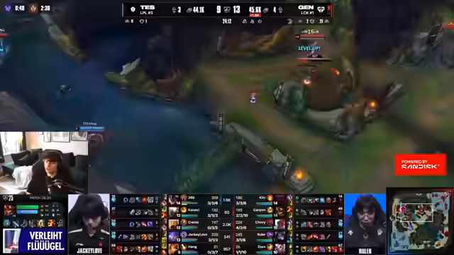 04:17:24Zurück im Spiel, beobachtet der Kommentator die Aktionen von Gen.G und TES um drake und Baron Nashor. Gen.G agiert dominant und führt mehrere Teamfights für sich, trotz mehrerer abgekühlter Ultimates. Gleichzeitig interagiert er stark mit der Chat-Community, gratuliert Followern für deren Spenden und beantwortet verschiedene Fragen. Auch Werbung für den neuen World's Pass und ein Gewinnspiel wird hier platziert.