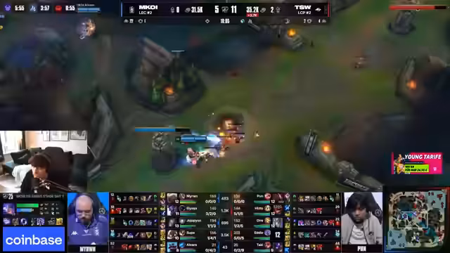 00:32:18Trotz eines starken Starts und einem Goldvorsprung verliert MCOY das erste Spiel. Der Streamer analysiert, dass dies an fehlerhafter Execution lag und dass TSW den Front-to-Back-Angriff von MCOY konterte, indem sie ihre starken Tanks nutzten und den AD-Carry Yumiko schützten. MCOY hatte keine Möglichkeit, durch die Verteidigung zu brechen, und verlor so den wichtigen Fight, was zum Game Over führte.