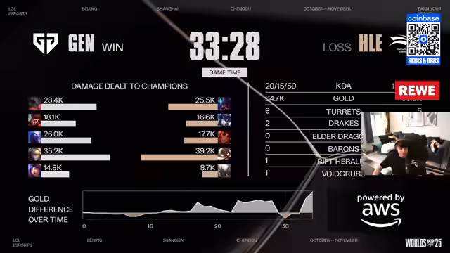 00:35:22Nach einem riskanten und gescheiterten Fight um den Herald und den Dragon befindet sich HLE in einer schwierigen Position. Der Streamer analysiert, dass HLEs Draft im Late-Game ein "Damage-Loch" hat und sie sich nur auf ein Ziel konzentrieren können. Gen.G nutzt dies aus und spielt aggressiv. Er kritisiert eine Entscheidung von HLE, die zu einem 4-4 Fight führt, den Gen.G für sich entscheidet, und sieht den Sieg als gesichert an.