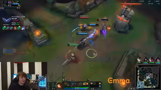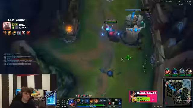 01:41:32Der Fokus kehrt zum Gameplay zurück. Es werden erneut kritische Situationen beschrieben, in denen das Team unterlegen ist und einzelne Spieler (z.B. der Jungler) negativ auffallen. Die Kommunikation mit dem eigenen Team wird als problematisch dargestellt. Es folgt eine kurze Unterbrechung für einen Prime-Dank, bevor weitere strategische Überlegungen zum Champion-Pick (z.B. Zed) angestellt werden.