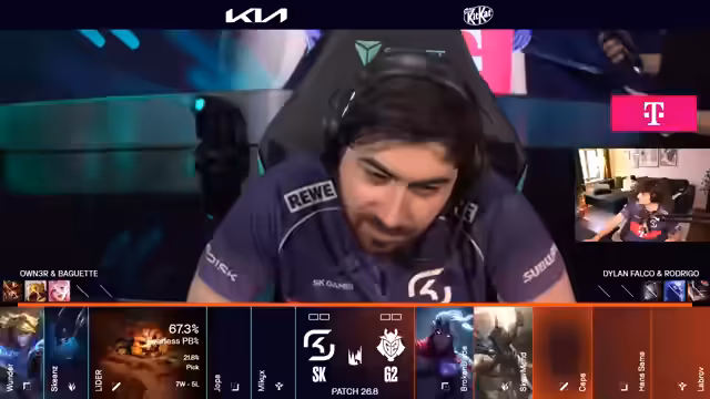 04:52:26O(streamer) conduz uma análise tática detalhada da equipe SK contra G2, discutindo os pontos fortes e fracos de ambos os lados. Ele menciona a situação da equipe SK precisando de duas vitórias em três séries. Ele critica alguns picks como Braum, sugerindo alternativas como Nami ou Leona para a linha inferior. Há também discussões sobre como as escolhas afetam a dinâmica da lane e a capacidade de engajamento em teamfights, com foco em champions como Renata Glasc contra certos compositions inimigas.