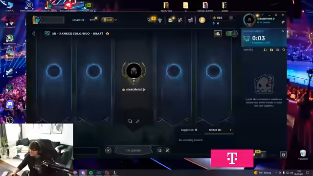 00:00:44Der Stream beginnt mit einem emotionalen Countdown zum Start des ADC-Projekts. Der Streamer bittet um Unterstützung für seine Reise und bereitet sich mental auf eine Zerreißprobe vor. Nach dem Kauf von Riot Points für ein begehrtes Emote beginnt das erste Game mit Jhin auf einem frischen Gold-Account. Die anfängliche Nervosität und die Herausforderung, sich auf das Last Hitten zu konzentrieren, sind spürbar, während er seine neuen Mitspieler als 'Smurfs' identifiziert und die Elo als besonders hart beschreibt.