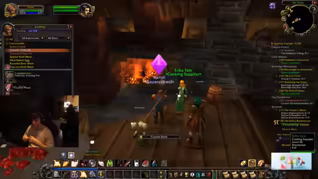 06:20:57Die Gruppe hat nun alle Ohren für die Quest eines Spielers gesammelt, außer eine fehlt noch. Es wird diskutiert, ob Questgegenstände gehandelt werden können, was verneint wird, da man die Quest aktiv haben muss. Während des Farmens auf Schweine für deren Gedärme wird das Problem des vollen Inventars erneut kritisiert, wertvolle Gegenstände müssen weggeworfen werden. Es werden Crafting-Rezepte für Spinnenfleisch und für Erste-Hilfe-Gegengift erwähnt, welche für bestimmte Berufe oder Klassen nützlich sind, wie zum Beispiel für Warlocks.