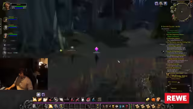 06:25:47Die Gruppe ist mit dem Questen im Gebiet aktiv. Es wird über Buffs diskutiert und eine Questreihe wird abgeschlossen. Der Streamer bemerkt, dass er überlevelt ist, was das Farmen von Quest-Items erschwert. Die Gruppe beschließt, zu den Low-Level-Quests zu wechseln, um effizienter zu leveln.