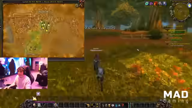10:47:26Im Stream wird über die Organisation einer Gruppentätigkeit gesprochen. Zuerst geht es um die Questline für den Dungeon 'Dead Mine', welche als P-Quest dient. Die Gruppe befindet sich momentan in Westfall und muss zur Vor-Quest 'Defears Brotherhood' in Seenhain und Rotkamm aufbrechen. Es ist eine Hin-und-Her-Quest, die viel Laufen erfordert. Parallel dazu wird über das Sammeln von Fleisch und der Verteilung der Beute gesprochen, wobei ein Spieler gerne alles kochen möchte, während es ein anderer verkaufen würde.
