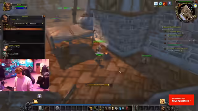 09:52:35Nachdem die Gruppe die meisten Quests in Westfall abgeschlossen hat, konzentriert sie sich darauf, verbleibende Items wie Schweine und Greifenzähne zu farmen. Es kommt zu einem humorvollen Streit über den Umgang mit vollen Inventaren und die Verteilung der looteten Gegenstände. Der Streamer, dessen Inventar bereits voll ist, muss seine Rucksäcke verwalten und entscheidet sich dafür, an einen Händler zu gehen, um Platz zu schaffen und nicht benötigte Gegenstände wie Linentuch-Ballen zu verkaufen.