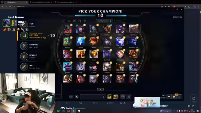 00:10:31Während des Gameplays konzentriert sich der Streamer auf ein Ezreal-Spiel, das er als unklug für den Start des Tages bezeichnet, da seine Finger noch nicht aufgewärmt sind. Er kommentiert die Schwierigkeiten in der Lane gegen Caitlyn und Janna und lobt die Leistung seines Pyke-Supports. Trotz eines guten Starts und eines frühen Drachen ist das Spiel von technischen Problemen auf seinem PC begleitet, die sich in Rucklern und einem nicht-flüssigen Gameplay äußern. Er vermutet ein PC-Problem, das schon seit zwei Wochen besteht. Das Spiel entwickelt sich zunehmend schwierig, und er muss sich eingestehen, dass es verlierbar ist, da die Gegner, insbesondere Caitlyn, sehr stark werden und seine Waves farmen. Die Diskussion über die Spielbalance von Caitlyn und die Notwendigkeit eines Nerfs kommt auf, da ihr Schaden als übertrieben empfunden wird.