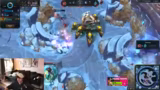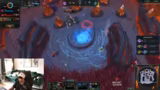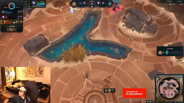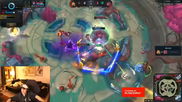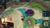 01:56:24Nach einer unglücklichen Team-Konfrontation, die zu einem Tot führt, hat der Streamer einen 'peanut brain moment'. Er hatte fälschlichererweise geglaubt, sein Teamkollege der Mundo sei sein Verbündeter und die gegnerische MF bereits besiegt, weswegen er seine Ultimate nicht einsetzte. Diese Fehleinschätzung führt zu emotionalen Reaktionen. Er wirft den Mitspielern 'Tilt' und 'Ego-Play' vor und erklärt seine Niederlage als deren Fehler, wobei beide Teams Ultimate-Fähigkeiten und 'Spike' verschwendet haben.