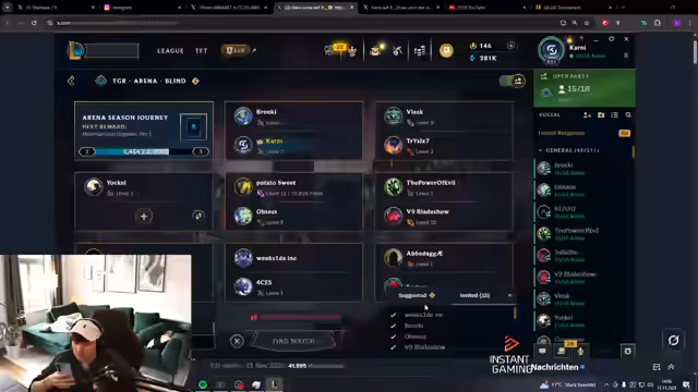 04:42:51Der Streamer diskutiert die ' Arena '-Meta und beschreibt, wie tryharte Spieler auf hohem Niveau (z.B. Level 12) vorgehen. Er erwähnt, dass diese Spieler fast immer ' Magi Felix ' in ihren Lobbys haben, da dieser Champion stark in der Arena ist. Er stellt fest, dass es keine sichtbare Rangliste gibt, aber ' MNR (Maybe Not Ranked) ' weiterhin existiert und man sich der Meta anpassen muss, um nicht auf dem letzten Platz zu landen. Er kritisiert die hohe ' Social Pressure ' und den Zwang, immer auf dem höchsten Niveau zu spielen.