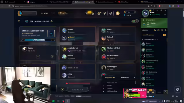 03:34:11Ein Werbespot für 'Wexer' läuft, wobei der Streamer sich über die Formulierung 'mehrkostenfrei' lustig macht. Die User-Engagement ist hoch, und eine geplante Arena-Session mit einem Partner 'Brücki' wird vorbereitet. Für das Turnier werden hochgerollte Augments erhalten und deren Funktion erklärt. Ein interaktives Element, bei dem die Chat-User eine Zahl von 1 bis 3 tippen können, wird eingeführt, um die Teilnahme am Turnier zu bestimmen.