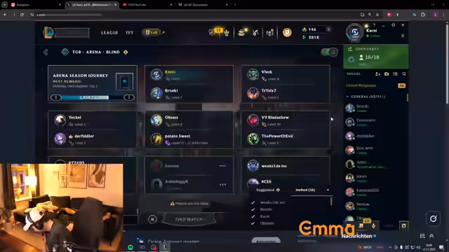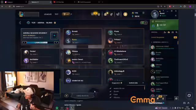 04:07:33Die Diskussion konzentriert sich auf die Fairness und die Regeln des anstehenden Arena-Turniers. Es wird die Frage aufgeworfen, ob das Matchmaking fair ist, wenn Spieler mit unterschiedlichen Arena-Levels gegeneinander antreten. Die Spieler spekulieren über die Anwesenheit von hochrangigen Spielern wie Abedagge und Zertus in der Lobby und deren mögliche Auswirkungen auf das Turnier. Es wird beschlossen, Team 8 auf dem Autofield-Arena-Server zu reservieren, um Transparenz zu schaffen. Die Spieler tauschen sich über ihre Erfahrungen mit dem Arena-Modus aus und stellen fest, dass viele Spieler 'Bravery' spielen, was bedeutet, dass sie sich auf zufällige Augments verlassen. Es wird auch über die Möglichkeit gesprochen, gemeinsam zu streamen und das Feature 'Gäste einladen' häufiger zu nutzen.