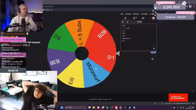 00:01:22Der Fokus verschiebt sich auf die konkrete Spielplanung. Die Liste der möglichen Spiele wird besprochen, darunter die Führerschein-Theorie-Prüfung, die als herausfordernder Titel angesehen wird, da man sich gezielt vorbereiten müsste. Es gibt Diskussionen zu anderen Spielen wie Flappy Bird, das jedoch abgelehnt wird, zugunsten eines als 'viel lustigerer' Alternative. Andere Titel wie Fortnite und Peak (das erst noch installiert werden muss) fallen ebenfalls in die Diskussion. Des Weiteren wird die Idee eines Glücksrads eingeführt, das die Anzahl der benötigten Wins pro Spiel bestimmen soll. Es wird klar, dass das Glücksrad Modifizierer wie Back-to-Back-Runs oder spezielle Regeln enthalten kann.