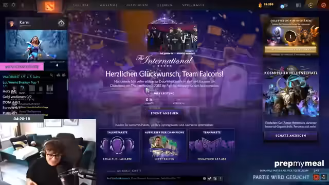 04:48:20Nach dem Verlust im Arena-Modus diskutiert das Team das nächste Spiel. Ein Glücksrad entscheidet, und sie rollen auf Dota 2 mit der Aufgabe, drei Siege in diesem Spiel zu erringen. Es entstehen Diskussionen über den langen Download von Dota 2 (90 GB) und die Herausforderung, gegen erfahrene Spieler anzutreten.