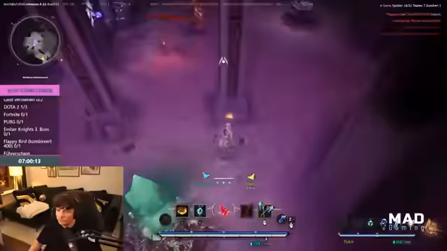 06:34:10Der Streamer startet in das Gameplay von Acheron, ein 3-gegen-3 PvP-Spiel mit Arena-Style und Dungeon-Elementen. Die Steuerung wird mit WASD erklärt, und vier Fähigkeiten stehen zur Verfügung. Es folgen Kämpfe gegen Gegner, bei denen die neu erlernten Mechaniken und Kombinationen ausprobiert werden. Herausforderungen wie das Wiederbeleben über Schreine und die Nutzung von Amulets werden diskutiert, während das Team versucht, sich in dem neuen Spiel zurechtzufinden.
