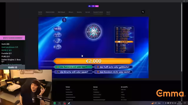 11:09:48Der Fokus verlagert sich auf eine Wette im Zusammenhang mit einer Millionärs-Challenge, bei der eine Wette für das Tierheim in Berlin im Spiel ist. Es wird über die finanziellen Bedarfsschätzungen spekuliert und ob sie das nötige Budget erreichen können. Parallel dazu beginnt die erste Runde 'Wer wird Millionär?' mit grundlegenden Fragen, die unterhaltsame Diskussionen und teils absurde Begründungen der Antworten auslösen.