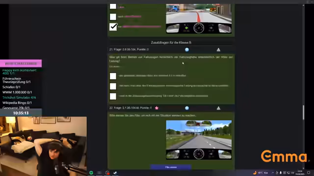 11:21:00Nach der Millionärs-Challenge wechseln sie zur GeoGesser-Übung (wahrscheinlich GeoGuessr). Es wird über das Spiel gesprochen und wie man es gemeinsam spielt, inklusive Einladungen per Discord. Parallel dazu beginnen sie mit einer Führerschein-Testsimulation, bei der sie Verkehrsfragen beantworten. Dies zeigt die weitere Kooperation, die von Streaming-Partnern unterstützt wird, und die Bereitschaft, verschiedene Spiele zu erproben.