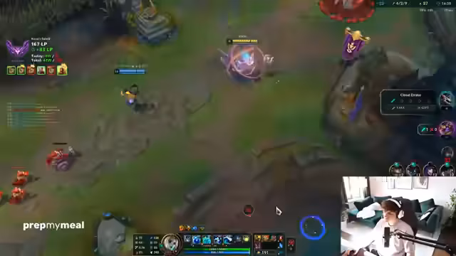05:47:38In einem Aram Mayhem-Spiel nutzt der Streamer Twitch mit einem 'Full on Hit' Build. Er kritisiert nach dem Tod, dass der gegnerische Zed ihn klickte, während er in der Shaco-Passiv war. Im späteren Verlauf baut er 'Death Dance', um mehr Tankiness gegen den physischen Damage zu erhalten. Trotzdem wird er vom gegnerischen Ornn, der 'casually most damage gemacht' hat, getötet. Das Spiel endet nach 'Whisky-1' mit GG. Für den 'MVP' des Spiels wird ein Preis ausgeloben. Anschließend wird eine neue Lobby mit dem Titel 'Twitch Prime' für ein weiteres Aram gestartet.