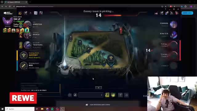 05:50:42Der Stream beginnt mit dem Fokus auf das LoL-Spiel, wobei der Streamer auf einen Heartsteel-Quest für einen Rakan-Skin abzielt. Es werden Champions wie Rakan und Poppy diskutiert, und der Streamer erwähnt seine Mors-Bestellung. Während des Spiels gibt es technische Probleme mit dem Smartcast für seine Fähigkeit E, was ihn verunsichert. Es werden auch Anekdoten über die Vergangenheit und die Gründe für den Umzug aus Bayern geteilt. Das Spiel wird als "insane" beschrieben, und es gibt Diskussionen über den Champion Poppy, der als langweilig angesehen wird.