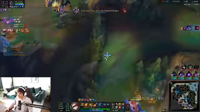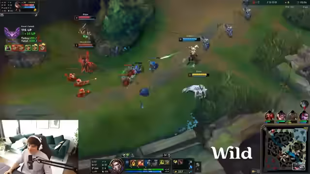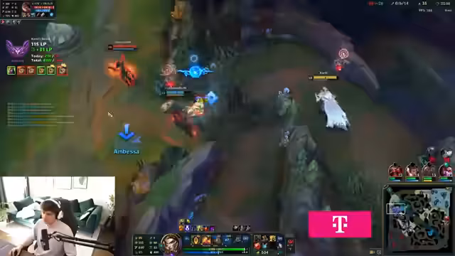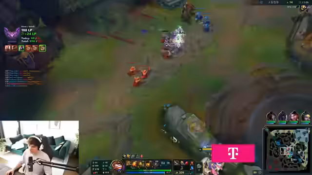 05:59:53Während des Spiels kommuniziert der Streamer intensiv mit seinem Team über Koordinationsprobleme und strategische Fehler. Es wird kritisiert, dass Mario sterben gelassen wird. Der Streamer ist frustriert, weil er keine Heartsteel-Stacks kriegt und stirbt. Es wird über Champions wie Kiana und den Gebrauch von Heartsteel gesprochen. Nach einem erfolgreichen Game mit 1000 Heartsteel-Stacks feiert der Streamer den Sieg. Es gibt auch Diskussionen über technische Probleme wie das Glisten in Spectator-Modus.
