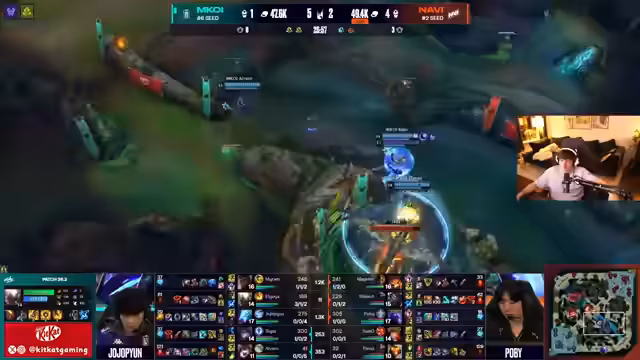 07:41:21Das Spiel schreitet voran und Navi gerät zunehmend ins Hintertreffen. Der Streamer beschreibt, wie M.Koy kontrolliert das Spiel, den zweiten Drake in kurzer Zeit nimmt und Navi "bitterböse outscaled". Ein entscheidender Teamfight wird analysiert: M.Koy hat perfekte Vision und setzt den Flank von Navi erfolgreich um. Der Support von Navi, Paros, agiert zögerlich, was den Kampf verliert. Analyst kritisiert den Timings und die Positionierung von Navi scharf, insbesondere den späten Einsatz von Bards Ultimate und fehlenden Damage, um irgendjemanden von M.Koy zu töten.