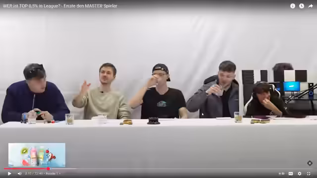 00:23:32Nach verschiedenen Ankündigungen beginnt eine interaktive Segment namens "Guess the Master". Der Streamer präsentiert mehrere Personen, die behaupten, Master-Spieler in League of Legends zu sein. Das Ziel ist es, die echten Masterspieler von den Lügnern zu unterscheiden. Die Teilnehmer stellen sich kurz vor, nennen ihren Namen, Alter, Rolle und Champion. Die erste Kandidatin, Lena, wird vorgestellt, die sich als Anivia OTP ausgibt. Es entsteht eine Debatte über ihre Glaubwürdigkeit, da sie sagt, sie habe in der Mitte keinen Master erreicht, sondern nur im Support. Der Streamer kritisiert dies, da Roaming als essentiell für den Climb im Support gilt.
