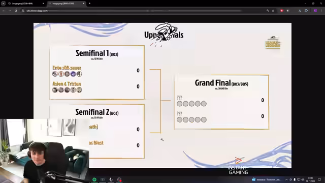 00:02:49Der Streamer informiert über den gestrigen Verlust im Tiebreaker und den Abstieg ins Loser-Bracket des Turniers. Er äußert seine Enttäuschung darüber, dass ein Aufstieg vom Loser-Bracket ins Winner-Bracket nicht möglich ist, was bedeutet, dass sein Team nicht mehr den ersten Platz erreichen kann. Das Turnier ist nun in zwei separate Brackets aufgeteilt: das Lower-Final und das Upper-Final. Im Lower-Final geht es um 10.000 Euro, während im Upper-Final 20.000 Euro auf dem Spiel stehen. Das Team wird im Lower-Final gegen Team Brücki antreten, um ins Lower-Bracket-Finale einzuziehen, welches ein Best-of-3 ist. Die Top-Teams im Upper-Final sind Ente Süssauer, Asien und Tristan gegen Many Men und die Schönen und das Biest. Der Streamer war gestern sehr aufgewühlt und konnte lange nicht einschlafen, da er sich ärgerte, es nicht in die Top 4 geschafft zu haben.