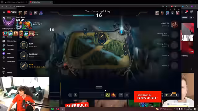 00:00:07Der Stream beginnt mit technischen Vorbereitungen und der Ankündigung, die nächsten drei Monate als Mage mit Ausdauer zu spielen. Der Streamer sucht nach einem Gaming Dia-Rank und kommentiert den anstehenden Restart. Die Champion-Picks für das erste Spiel werden festgelegt, wobei Xerath als Mid-Laner gewählt wird, während andere Lanes noch offen sind. Der Streamer betont den Wunsch, nur zu gewinnen, und erwähnt, dass er nicht Rise in der Sololane spielen wird.