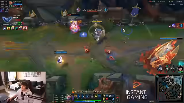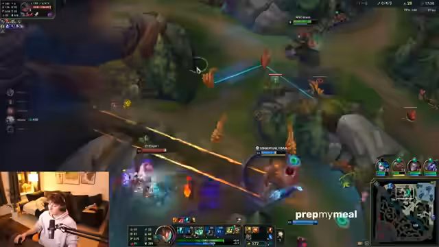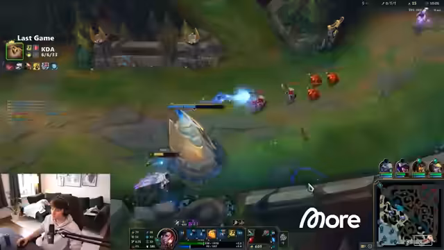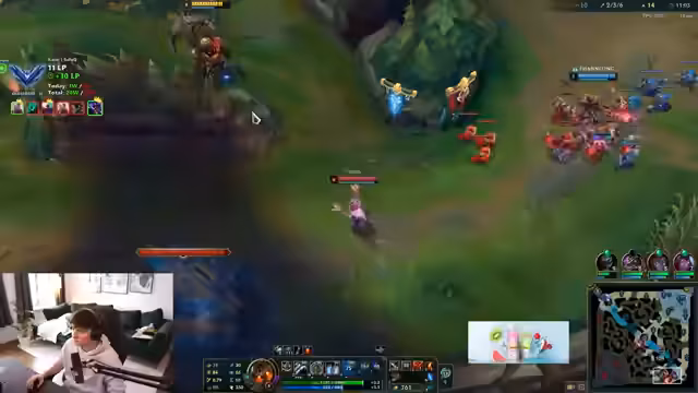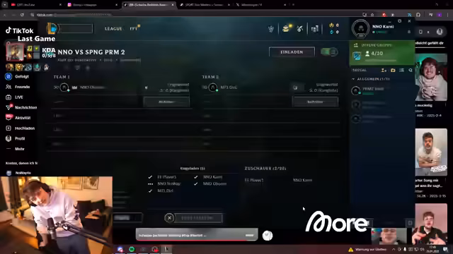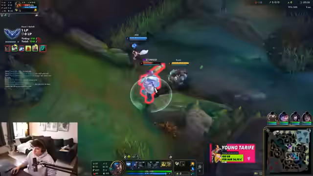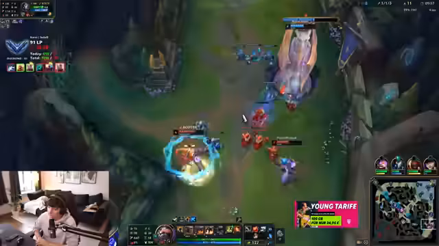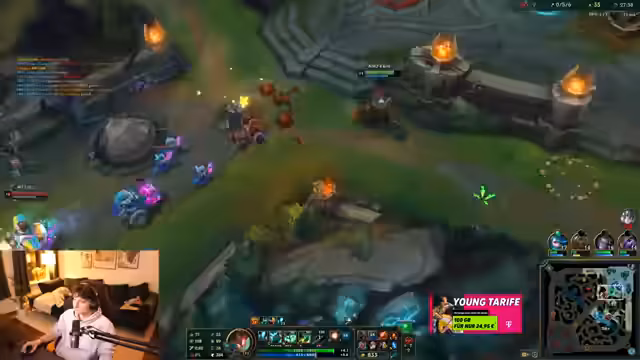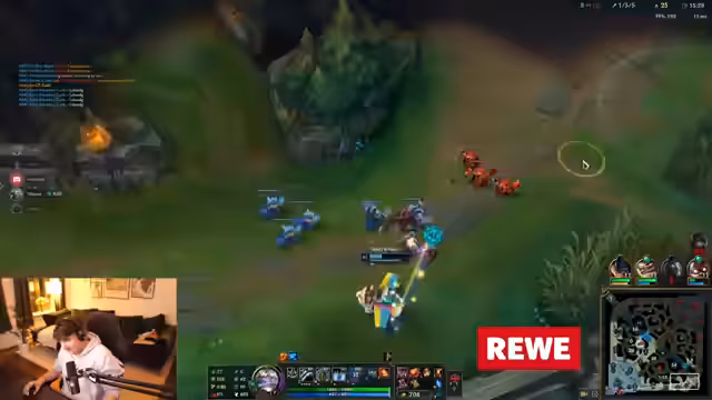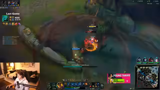 10:40:13Das League-of-Legends-Spiel beginnt sehr intensiv. Die Streamer agieren proaktiv und gewinnen einen frühen Fight. Es kommt zu ständigen Positionskämpfen und Rotationen über die ganze Map. Das Team plant einen Drake-Fight, doch die gegnerische Rotation ist schneller. Trotzdem gelingt es ihnen, in einem Fight den gegnerischen Jace zu eliminieren und einen Vorteil zu erlangen. Die Kommunikation ist schnell und die Entscheidungen werden unter Zeitdruck getroffen.