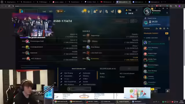 04:25:51Die Team-Speak-Kommunikation für das anstehende Prime-League-Match wird chaotisch beschrieben. Nur der Speaker, Toni und Riku sind im Channel, andere sind in anderen Spielen (z.B. Tolkien) oder noch nicht eingeloggt. Die Gegner verwenden Smurf-Accounts, was das Scouting und die Draft-Vorbereitung enorm erschwert, da die wahren Elo-Ratings und Champion-Pools verborgen bleiben. Es wird versucht, einen Draft-Plan zu schmieden, während gleichzeitig technische Probleme (z.B. Türkisch-Sprach-Client) und eine allgemeine Unorganisiertheit im Team herrschen. Der Speaker äußert Frustration über die Smurf-Praxis, die er für unfair hält, auch wenn er eingesteht, dass sein Team ähnliche Praktiken anwendet.