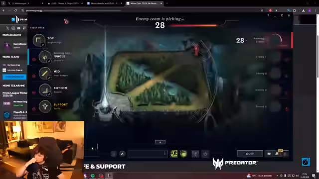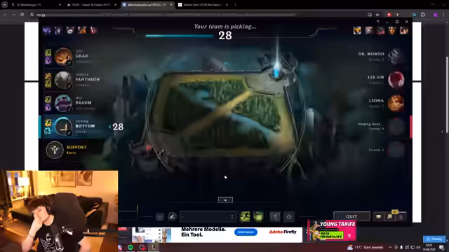 00:01:48Der Streamer fragt, ob Brücki live ist und was er gemacht hat. Er erwähnt, dass Wins in der Match History kommen könnten und sein ADC auf Support warm up macht. Beim Betrachten des heutigen Line-ups stellt er fest, dass es OG-Main in den Ohren gibt, außer im Jungle. Er zeigt sich etwas aufgeregt, aber zufrieden mit dem Setup. Er äußert, dass er zum Beispiel nicht mega happy, aber auch nicht unzufrieden ist. Er erwähnt auch, dass es Range-Support-Spieler sind, die momentan im Meta sind und dass es in jeder Serie dasselbe ist.