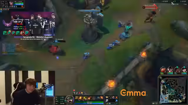 04:43:20Nach einem schweren Early-Game mit schlechtem Top-Laner („0-11-5“) und riskanten Entscheidungen wie Nami-Picks wird Grandmaster erreicht. Das Team muss sich trotz schwieriger Voraussetzungen (fehlende Summs, schlechte Positionierungen) zusammenraufen. Eine entscheidende Dragon-Soul-Phase wird diskutiert, wobei die Gegner Fehler machen („verkackt“). Durch geschicktes Ausnutzen dieser Schwachstellen und einen Nashor-Objektiv-Sieg wird dennoch der Sieg gesichert. Der Streamer feiert Grandmaster mit einem emotionalen „Let's Fucking Go“-Ruf.