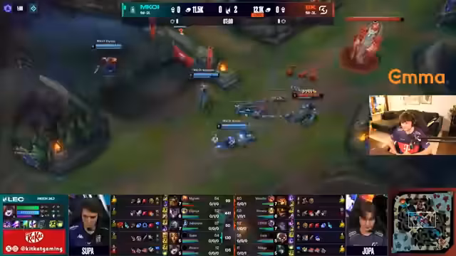 06:59:34Ryze hat noch keinen Flash, und SK sollte die Map-Kontrolle übernehmen. SK wird jedoch von MKOY überwältigt, da sie zu langsam agieren. Es kommt zu einem mexican standoff bei einem Drake, bei dem SK nicht fightet. MKOY gewinnt den Drake, und SK macht taktische Fehler wie zu spätes Angreifen und fehlendes Vision-Clearing. Micky stirbt in einem unvorteilhaften Fight.