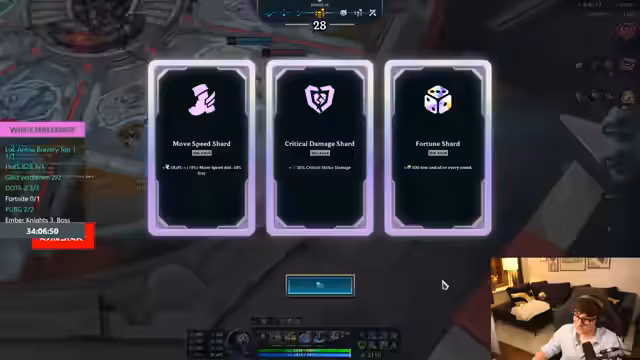 11:08:51Nach dem erfolgreichen ersten Bosskampf geht es im Ember Knights-Run weiter. Die Gruppe sammelt Relikte und Skills, diskutiert Stat-Boosts wie Bewegungsgeschwindigkeit und Schaden, und trifft strategische Entscheidungen im Shop. Hierbei werden Mechaniken wie das Teilen von Gold und das Auswählen von Upgrade-Optionen erläutert. Sie begegnen weiteren Mini-Encounters und Bosskämpfen, evaluieren ihre Fortschritte und den Nutzen von Skill-Bäumen, wobei die Steigerung der eigenen Stärke durch Meta-Progression ein zentrales Thema bleibt.