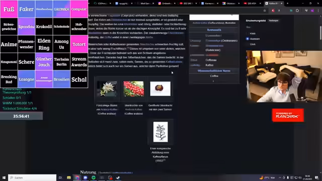 11:32:48Während eines der Teammitglieder auf eine Rückkehr wartet, organisieren die anderen ein Wikipedia-Bingo-Spiel auf einer Liste mit diversen Begriffen wie Gronkh, Faker und Mondlandung. Das Ziel ist es, von einem Wikipedia-Artikel zum nächsten zu navigieren, indem man auf die im Text angegebenen Links klickt. Das Team interagiert mit dem Chat, um gemeinsame Bingos zu finden, und das Spiel wird als eine unterhaltsame und geistig fordernde Aktivität betrachtet.